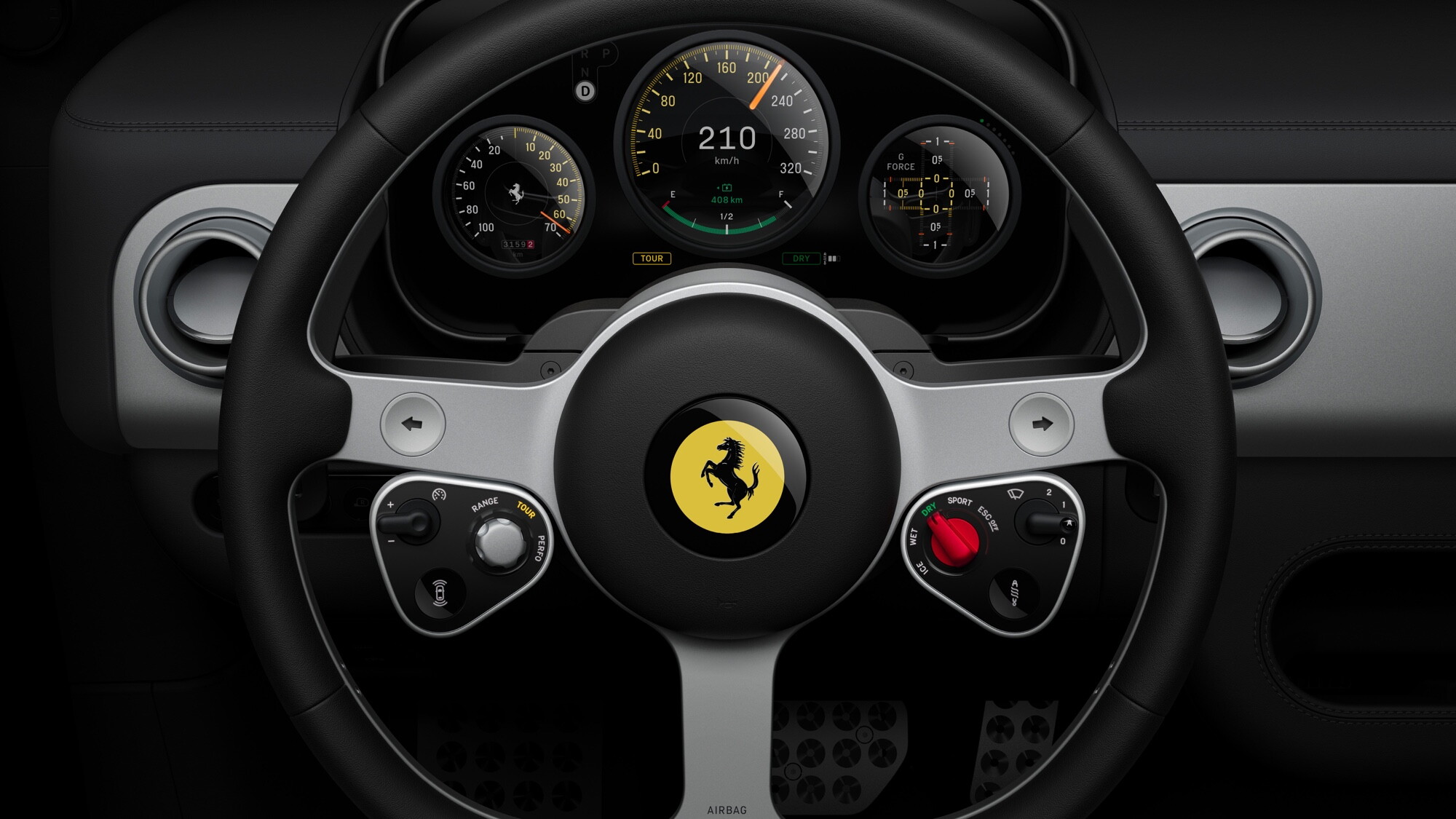 E' una sorpresa scoprire la Ferrari elettrica con un'architettura della plancia come mai si era vista finora. Dall'infotainment con la maniglia, ruotabile, alla strumentazione Binnacle, passando per le forme squadrate degli elementi e un'attenzione ai materiali tecnici e old style come le lavorazioni in alluminio